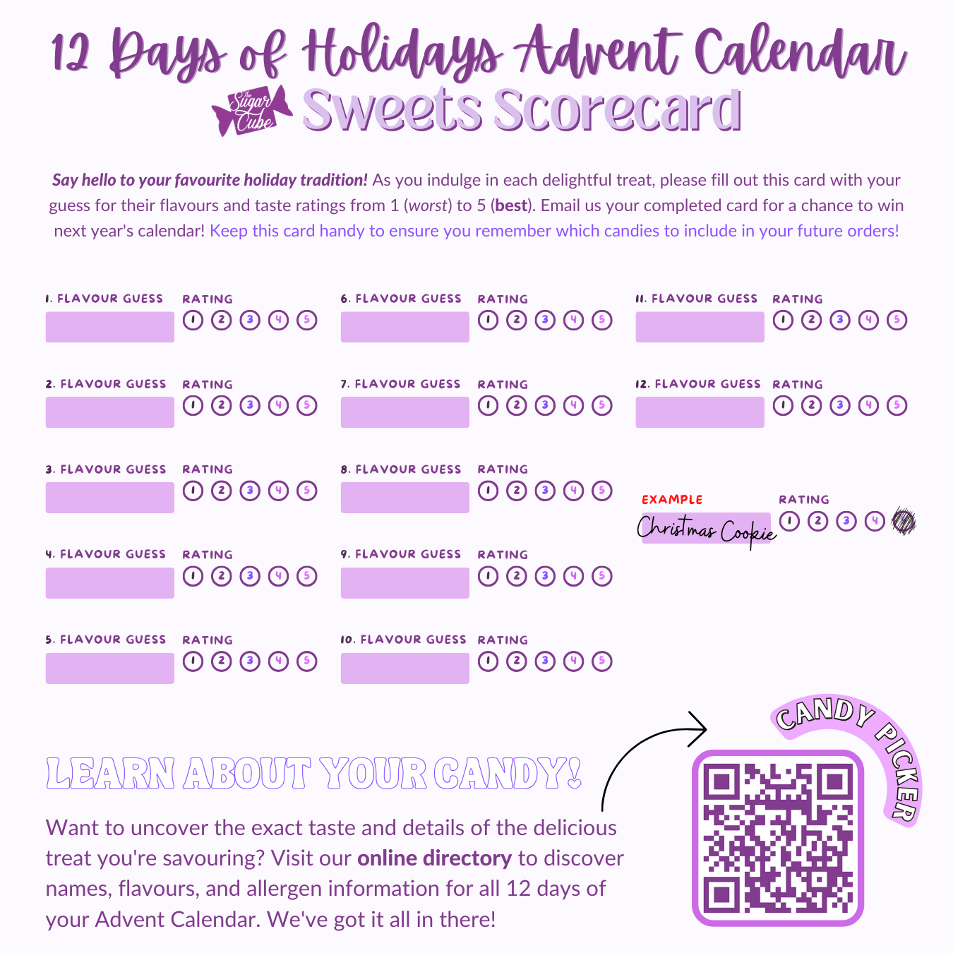 Every day is a chance to discover the sweetest surprises that await inside each cube in this countdown. Who knows what kind of deliciousness you'll find? Use this in collaboration with your Sweets Scorecard to find out what candies you consumed and make note of your favourites!