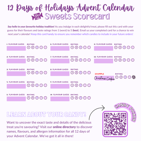 Easy! Simply click the 'Download Here' button below that corresponds to your Advent Calendar, and you can download a printable PDF of the matching Sweets Scorecard. Enjoy!